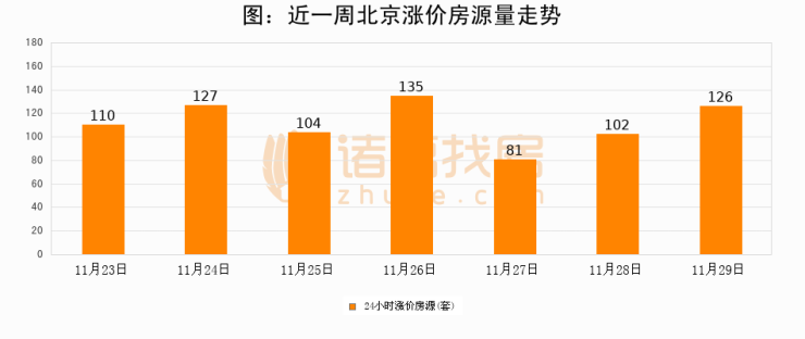 根据诸葛找房数据显示,北京24小时涨价房源量为126套,较11月28日增加24套,环比上涨23.5%。与此同时,涨价房源占比小幅扩大,业主信心有所提升。