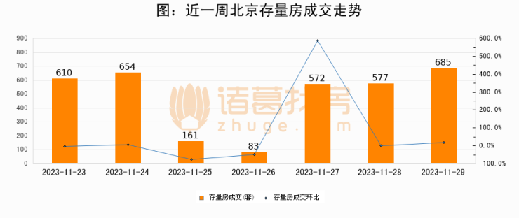从存量房来看,2023年11月29日北京存量房单日成交685套,比昨日增加108套,环比上涨18.7%。从近一周存量房成交来看,北京存量房日均成交套数为477套,11月29日单日成交685套,高于近一周平均水平43.6%。