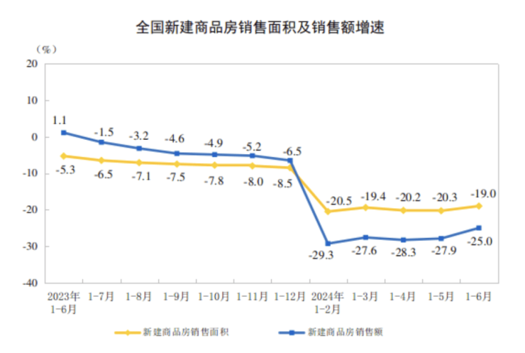 国家统计局新闻发言人表示,上半年,全国新建商品房销售面积、销售额同比分别下降19%、25%,降幅比1—5月份收窄1.3、2.9个百分点。
