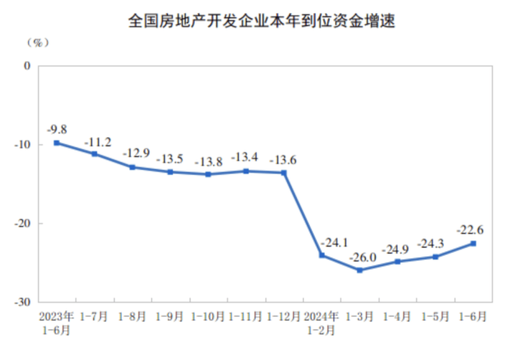 1-6月房企到位资金同比下降22.6%,连续3个月降幅收窄