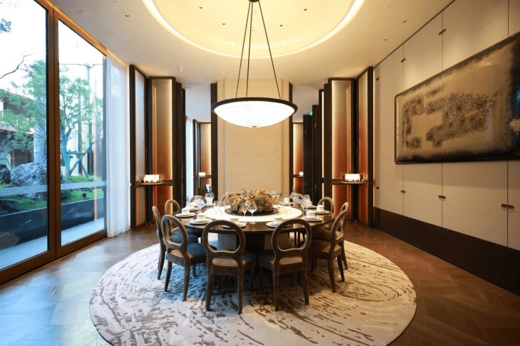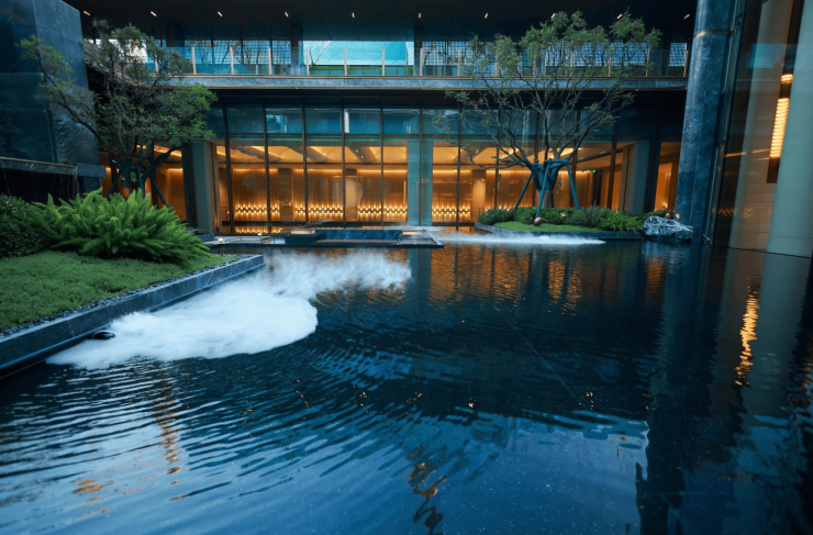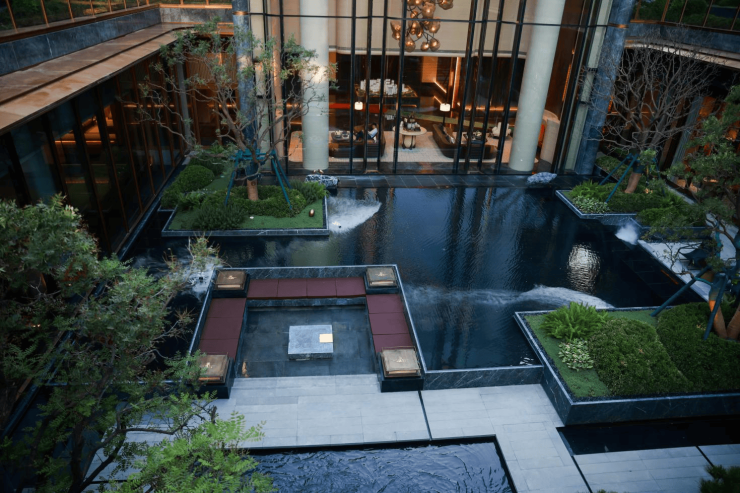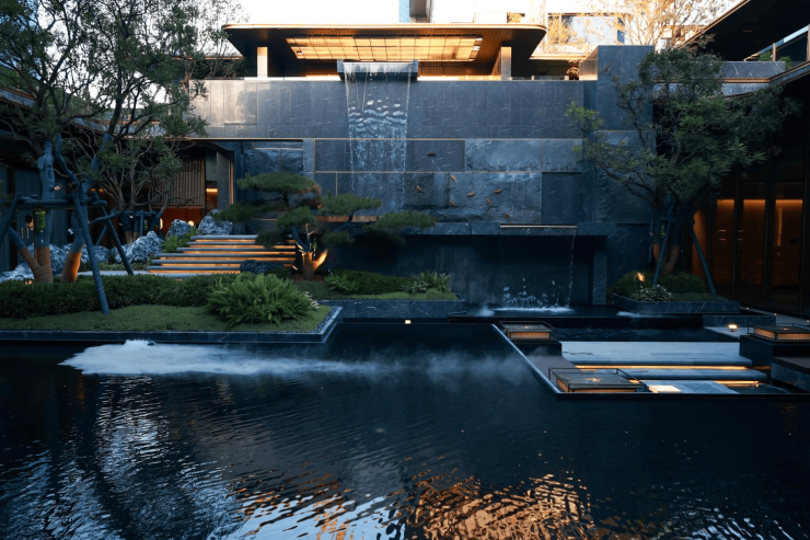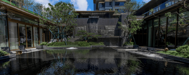 内院进深约23米,以置石、流水、造型元宝枫树营造山水意趣,巴马哈蓝石材经过人工拉槽打磨,打造6米高悬叠瀑,堆砌着千年宋式风雅。500㎡下沉庭院灵感来源于《千里江山图》所描绘的“九鲤飞瀑”,六米高差营造立体山水,松木、悬瀑、叠石形成自然隐秘之境。