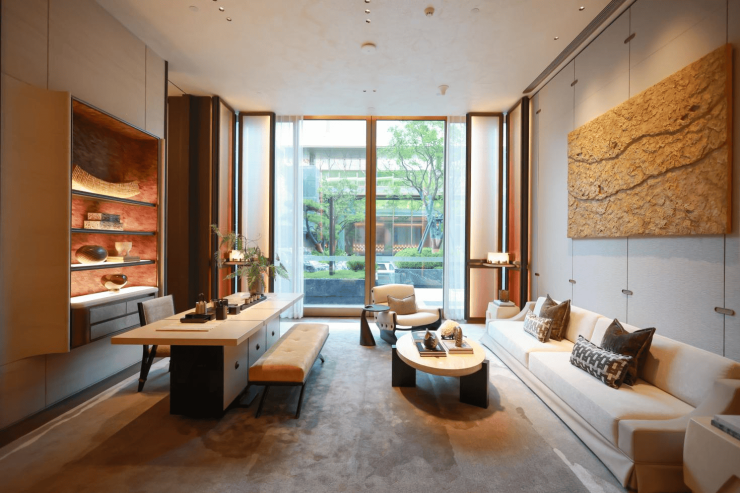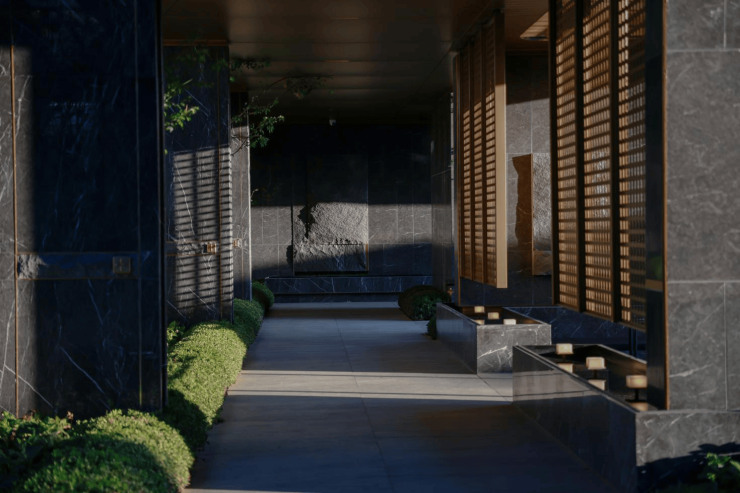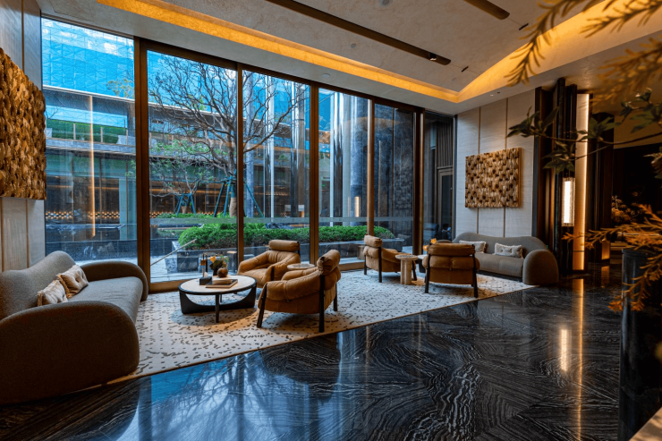 从下沉庭院拾级而上,进入风雨长廊,窗饰、金属网景墙与光影交叠,形成趣味盎然的归家序列。长廊两侧花境起伏、色彩温润,使归家过程如一场缓慢展开的艺术体验。长廊尽头的隐奢会客厅是高阶人群的私享场域,建筑玻璃盒子与庭院水景对望,茶几与座椅自然排布,融合东方美学与现代舒适,让生活成为随心而至的雅趣。