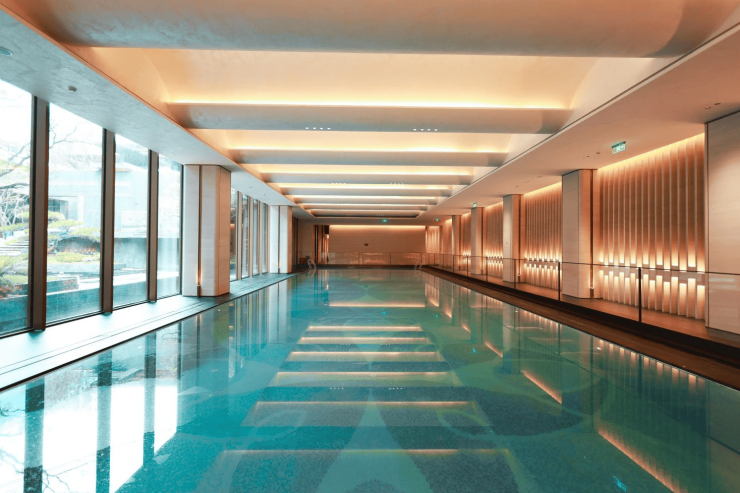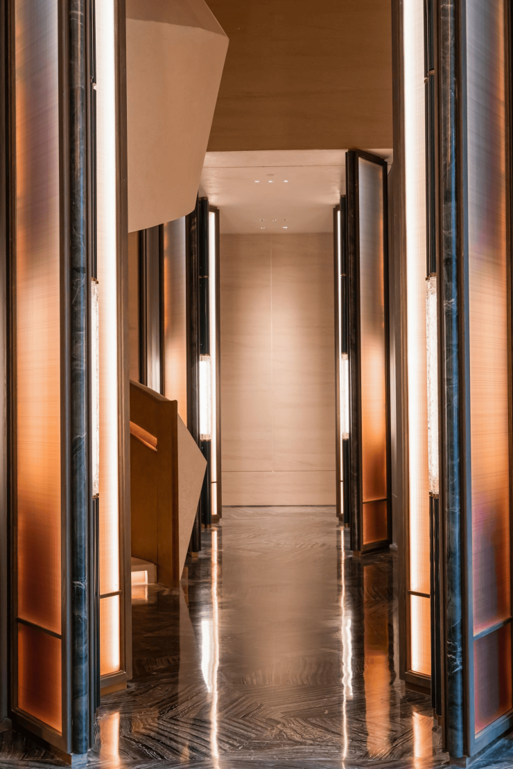 文化符号的现代转译,是这座会所的另一核心。楼梯间“如意云纹”抽象造型、屏风中融合故宫菱花格与项目LOGO的图案、泳池水面与天花倒影形成的“水石相映”意境,都让空间不只是物理存在,更承载了文化的隐喻。——北京隅·东序会所,最终希望呈现的是《长物志》中所言的“雅致生活”——在园中园、院中院的格局里,既有文人雅集的精神,又有现代生活的丰盛。