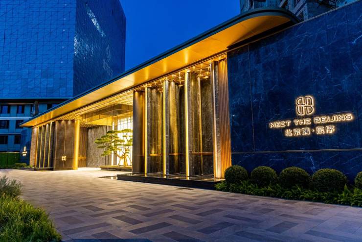 步入北京隅·东序示范区,首先映入眼帘的是约42米沿街而立的酒店式大门,与香港苹果店同款的透光奢石每一块造价过万,名松斜飘,水景倒映,精美的四椀菱花造型雕琢在两侧屏风上,如同社区张开双臂欢迎居者归家,五进九开间的布局,承载着中国古代官宅的礼序精神,城市的喧嚣在此被净化,归家的尊贵感与仪式感同时被放大。