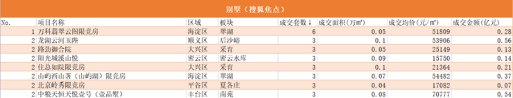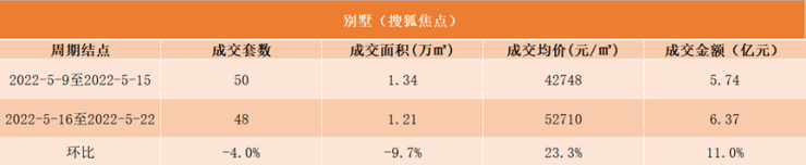 别墅方面,上周(5月9日-5月15日)别墅成交套数与前一周持平,依旧是成交50套,环比增长0%,而本周别墅交易套数小幅下降,成交套数由50套降至48套,环比下降4%。但成交金额却有所上升,由5.74亿元升至6.37亿元,环比上升11%。