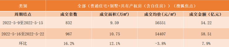 上周(5月16日-5月22日),新房市场成交继续升温,成交套数、成交面积、成交金额均呈现上升趋势,分别上升16.2%、12.1%、7.9%,仅成交均价呈下降趋势,环比下降3.8%。