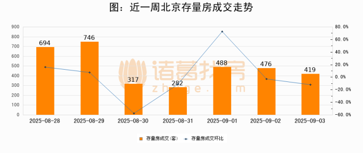 从存量房来看,2025年09月03日北京存量房单日成交419套,比昨日减少57套,环比下降12%。从近一周存量房成交来看,北京存量房日均成交套数为488套,09月03日单日成交419套,低于近一周平均水平14.1%。