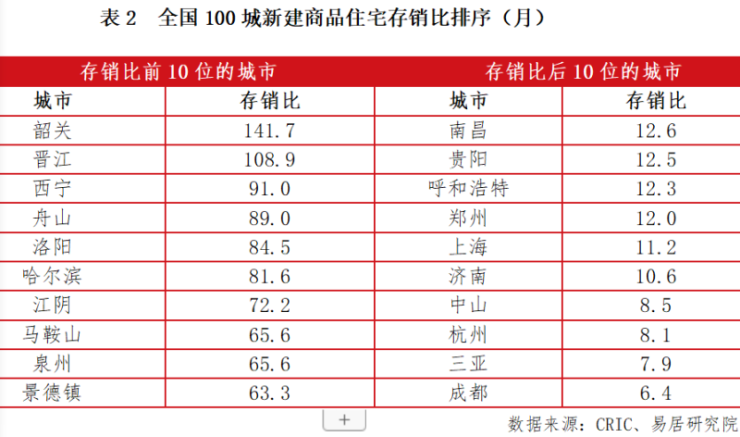 从具体城市来看,去化周期相对偏高的10个城市为:韶关、晋江、西宁、舟山、洛阳、哈尔滨、江阴、马鞍山、泉州和景德镇,多为三四线城市。而去化周期相对偏低的10个城市为:南昌、贵阳、呼和浩特、郑州、上海、济南、中山、杭州、三亚和成都。