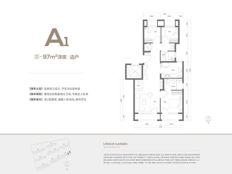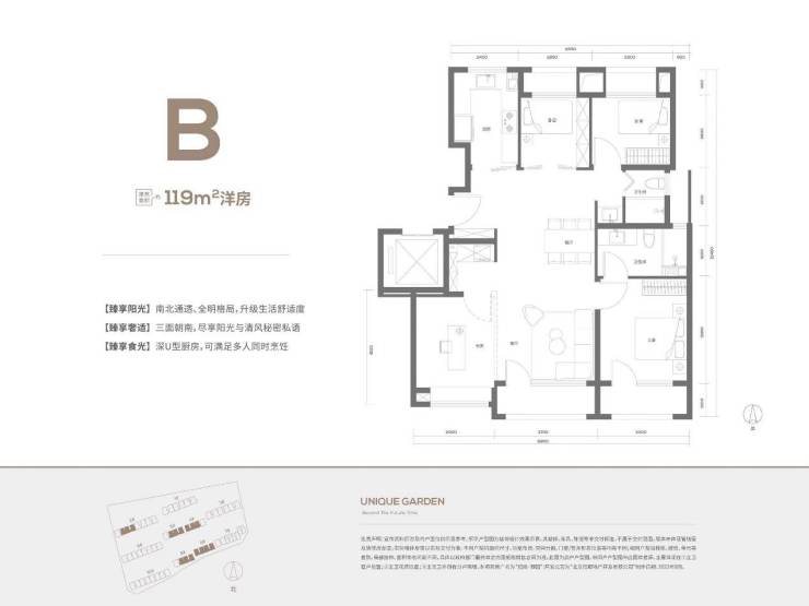119平三居户型,三面宽朝南,保证室内良好采光,主卧和客厅外均带有阳台;主卧套房设计,且卫生间是明卫,避免潮湿;U型厨房,使用率更高;客卫也有窗户,干湿分离。这个户型居住舒适度更高,适合三代人一起居住。