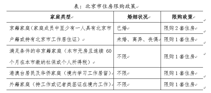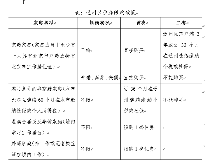 此前,通州区商品住房购置在北京市限购政策基础上具有更为严格的额外限购要求,俗称“双限购”,具体的政策规定如下表所示。
