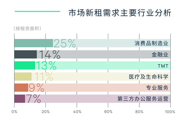 《中国经营报》记者注意到,在具体的行业需求方面,按租赁面积计算,以新能源汽车为代表的消费品制造业位居排名前列,占比达到25%,金融业、TMT、医疗及生命科学等分别位居其后。