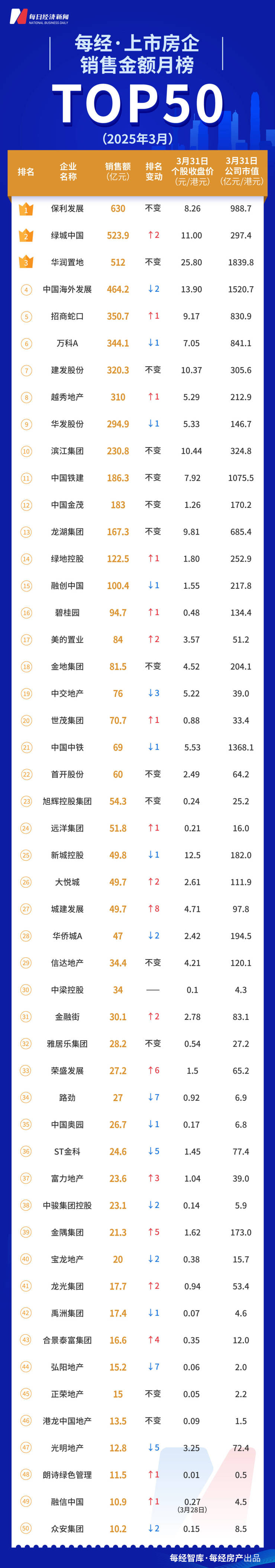 每经数读|3月上市房企TOP50多卖了1000亿元