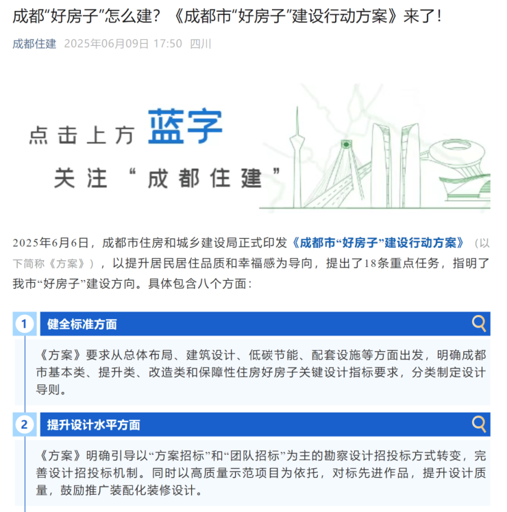 6月9日,据“成都住建”微信公众号消息,成都市住房和城乡建设局于6月6日正式印发《成都市“好房子”建设行动方案》(以下简称《方案》),从总体布局、建筑设计、低碳节能、配套设施等方面出发,提出了18条重点任务,明确成都市基本类、提升类、改造类和保障性住房好房子关键设计指标要求,指明了“好房子”建设方向。
