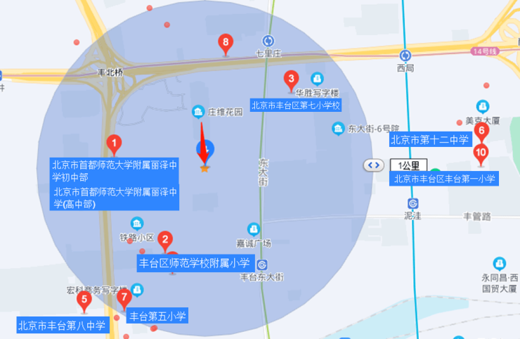 小学中学有区重点类前三名的丰台排名前列小学、丰台第五小学、丰台区师范附属小学,以及市重点的北京市第十二中学、丰台二中、首都师范大学附属丽泽中学和丰台八中。注:最终学校以教委划片为准