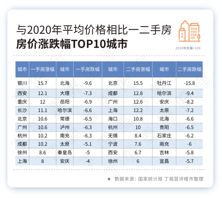 其中,新房价格同比涨幅较明显的有杭州、北京、银川、成都、西安,涨幅分别达到6.3%、5.8%、4.7%、4.5%和4.2%;下跌幅度较大的城市包括北海、岳阳、湛江、哈尔滨、南充,跌幅分别达到7.4%、7.1%、7%、6.8%、6.3%。