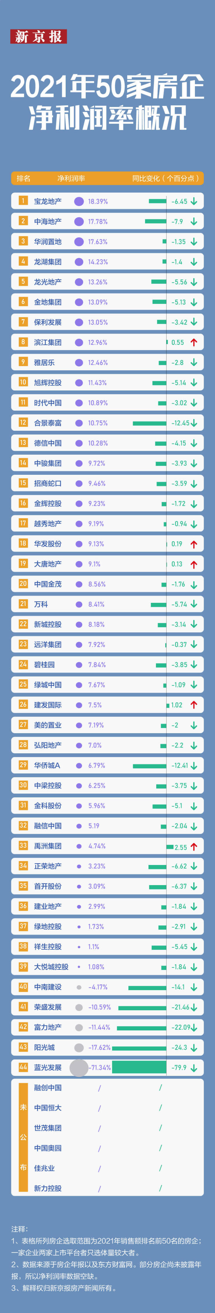 新京报房产新闻部对2021年度销售额排名前50强房企盈利指标进行复盘,在目前已披露财报的44家龙头房企中,选取归母净利润、净利润率、毛利率三个指标进行排序对比分析。此次,新京报房产新闻部推出《2021年50强房企净利润率盘点》,着重对反映房企盈利能力的重要指标——净利润率进行排序分析。
