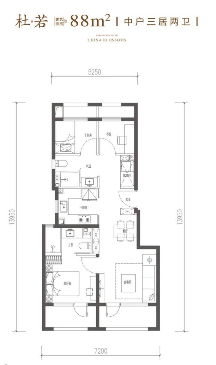建筑面积约88㎡三居双卫,南北通透、全明格局、超大落地窗、独立家政间,实用性拉满,得房率约在90%。
