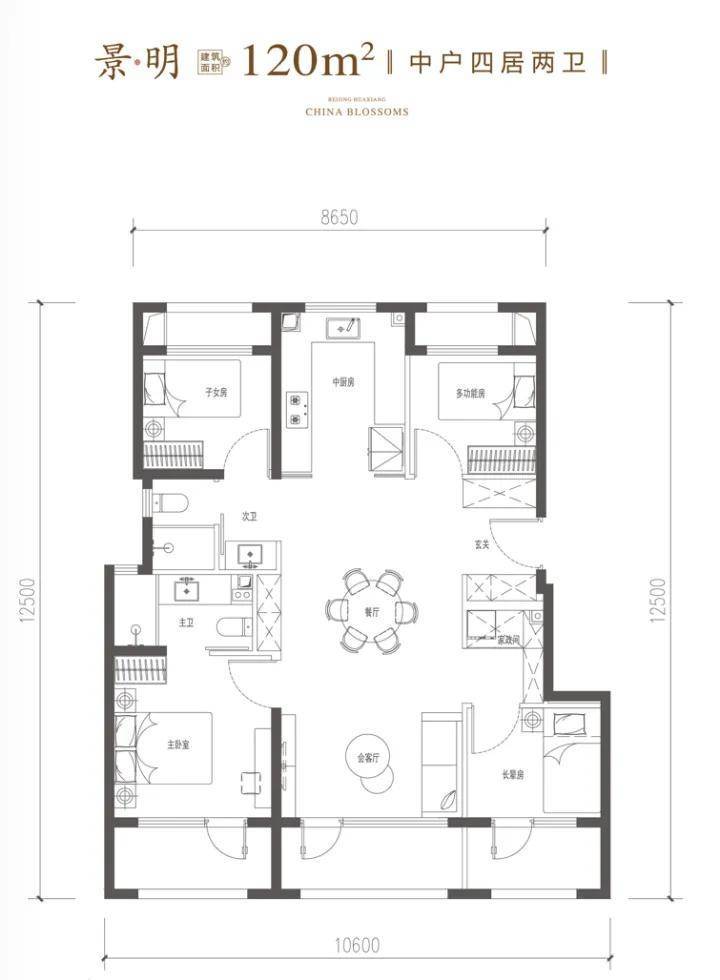 建筑面积约120㎡四居双卫,南向三面宽约10.6米,双卧朝南,同区四居中的TOP之选;LDKG一体,空间感与通透性上升一个层级,得房率可达95%。