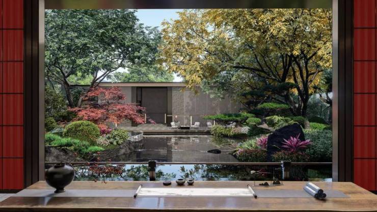 从西侧进入小区,中式景观大门后呈现第二卷“墨香”中心花园,在这里你可以领略到红桥执笔、莲花墨砚的东方气韵,也能感受洗砚影壁、水韵花笺的考究技艺与独特魅力。
