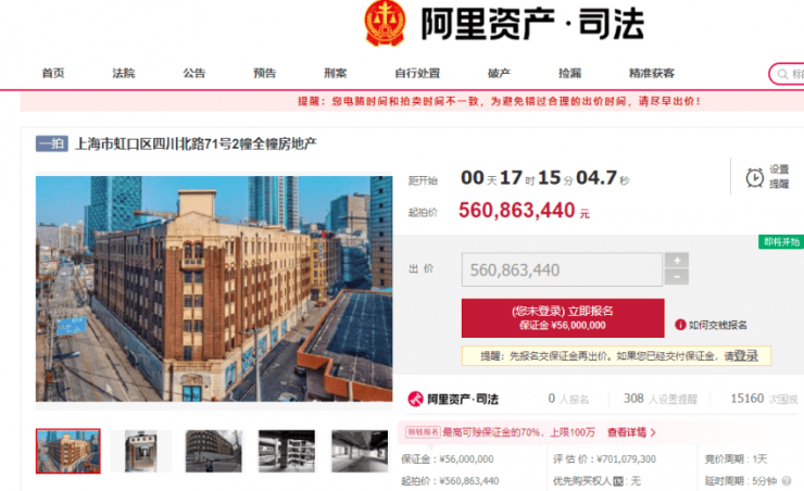 近日,起拍价高达5.61亿元的上海德邻公寓在阿里资产司法拍卖平台上因为无人报名竞价而流拍。