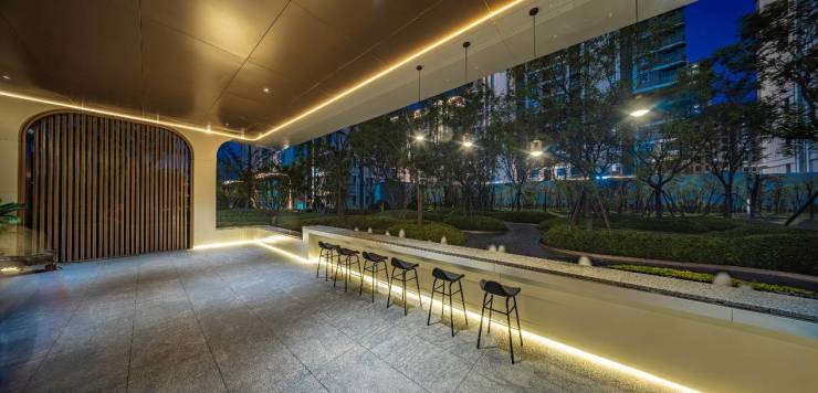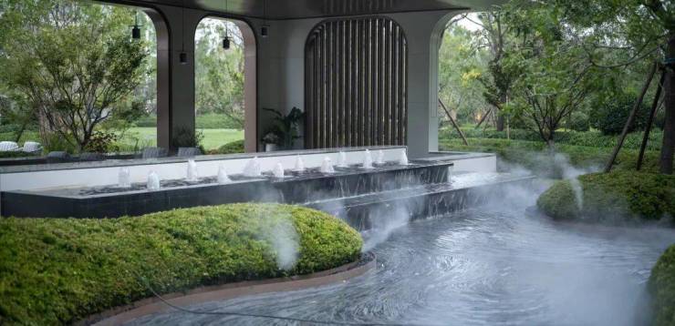 另外还为业主准备了交互会客空间,取名为:交互C客厅。业主一边可以享受自然美景又能享受闲适的休憩时光,另外客厅旁种植了多种树木,景观之间通过雾森系统增加空气湿度,产生的薄雾营造出一种朦胧、梦幻的视觉效果。