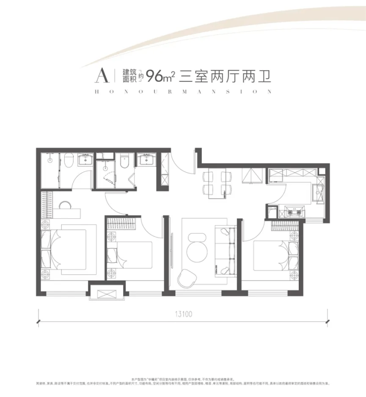 其中约96㎡的三居,做出了“客厅+三卧+厨房”4.5个房间都朝南,南向13.1米的大面宽,客厅还是落地窗,采光和视野都不错。