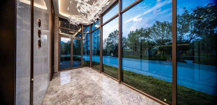 大堂是双层挑高,门头是豪宅标配铝板+玻璃的组合,地面采用的是纯天然大理石材,而华曦府的logo墙是仿石材面砖,还有金属背景墙面,电梯厅也是石材地面,尊贵感拉满了~