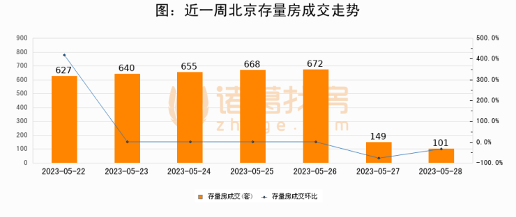 从存量房来看,2023年05月28日北京存量房单日成交101套,比昨日减少48套,环比下降32.2%。从近一周存量房成交来看,北京存量房日均成交套数为501套,05月28日单日成交101套,低于近一周平均水平79.8%。