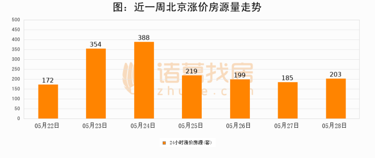 根据诸葛找房数据显示,北京24小时涨价房源量为203套,较05月27日增加18套,环比上涨9.7%。与此同时,涨价房源占比小幅扩大,业主信心有所提升。