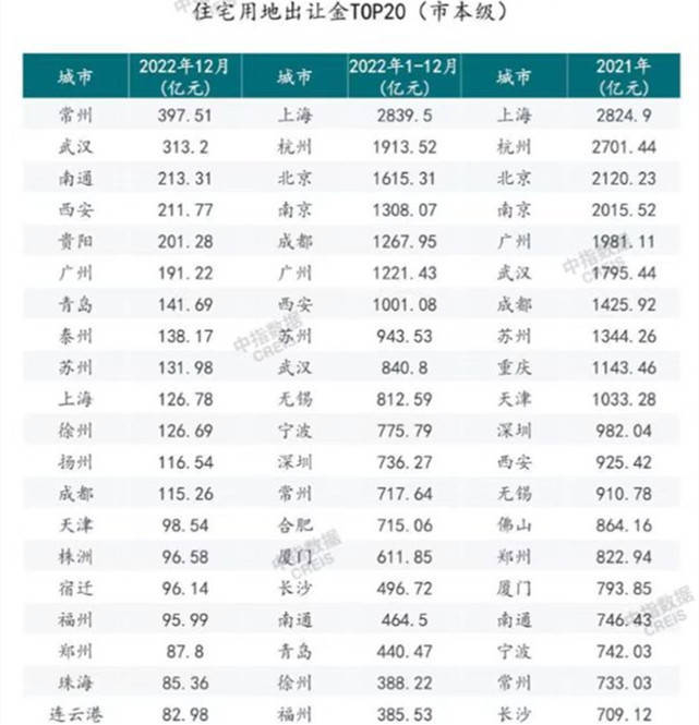 2022年,上海、杭州、北京、南京仍占据宅地出让金前四位,而成都替代广州成为第五位,天津、郑州跌出前20名榜单。