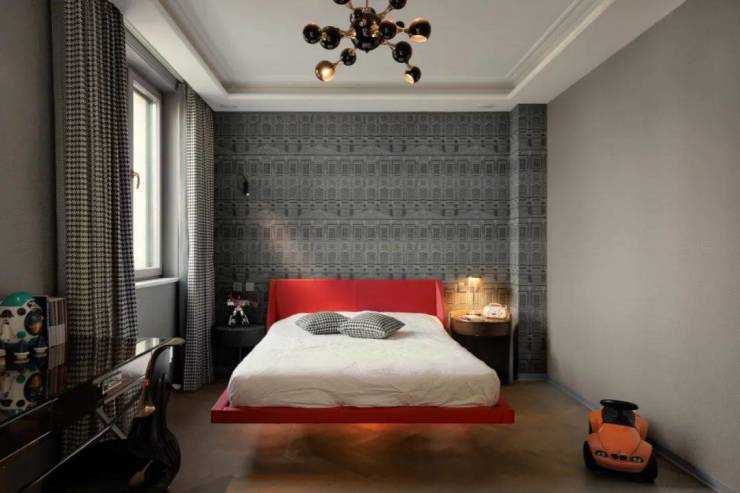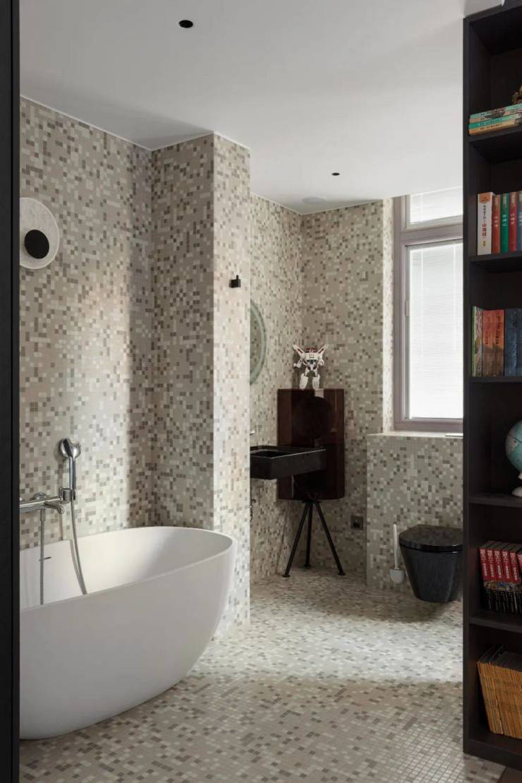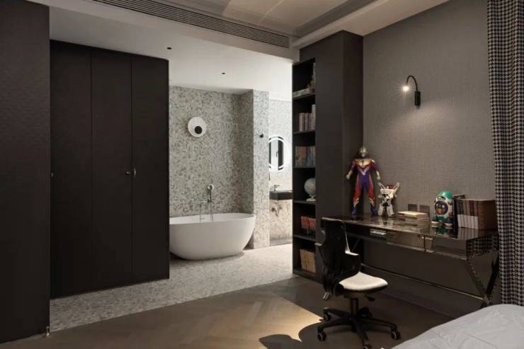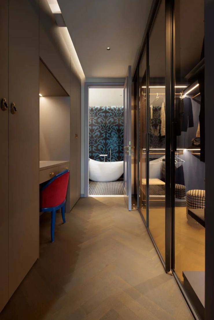 设计师引用中心构图法、由远到近、由近到远,跳跃性的配色有如精灵,灵活优游于主卧、衣帽间和卫生间,赋予空间跳跃性与想像感,丰富了整个感官的层次。