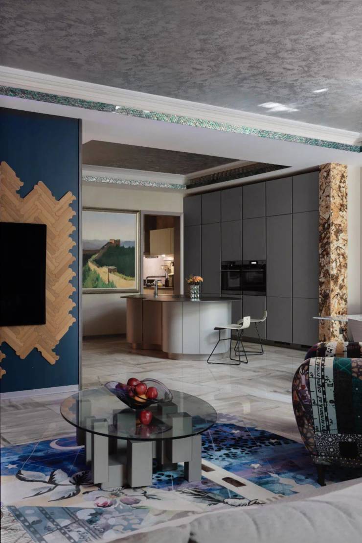 无论是装饰画中的自然之绿,抑或是窗帘、地毯经典的蓝,以及金色大理石垭口,都繁而不乱,与极具造型、现代简约的家具产生一种微妙的和谐,给居室带来宁静祥和的气氛。