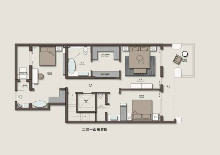 设计师利用回游动线串联起多个功能区,便于居住者进入卧室后一系列动线:换衣、洗澡、梳妆等。同时,回游动线的设置,在视觉上拓宽了空间格局,使空间的私密性与趣味性同在。