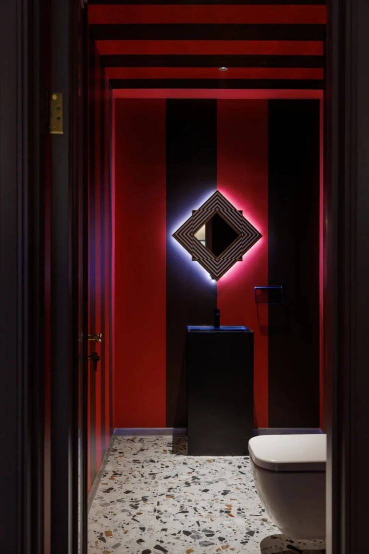 “火”是大自然的能量,生命文化进程的开始,人们用红色来定义“火”,代表旺盛的生命力。设计师在地下二层吧台、小舞台、卫生间的设计中,采用了大面积红色、在视觉上,颜色厚重,深沉,神秘,大色块撞击下带来强烈的视觉体验,心灵的震撼,形成身心合一无与伦比的感受。