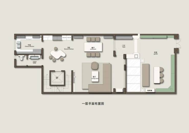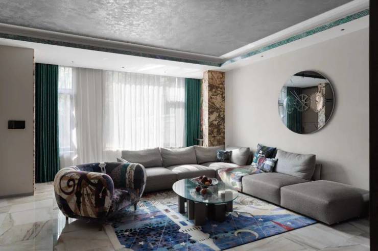 蓝色代表勇敢无畏。绿色代表境界,运程。金色代表着高贵,权利。设计师巧妙应用这些大自然中的颜色与大象灰进行搭配,使得位于别墅一层整个居室空间用色极富层次。