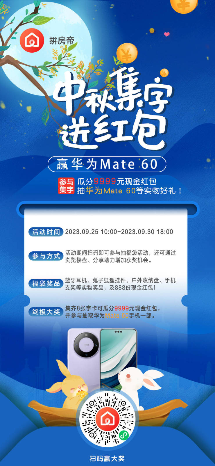 拼房帝中秋福利来袭~每日集字开福袋有机会获得现金红包!集齐所有文字可瓜分9999元现金红包,更有机会抽取华为Mate60等实物好礼!