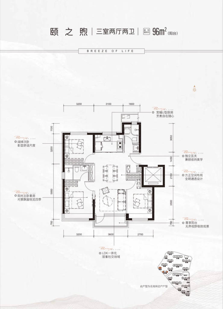 解析:南北通透两居,客厅面宽3.3米,主卧和客厅均带有飘窗,有独立的餐厅位置,另外值得一提的是,边户的话餐厅旁边还有一个观景窗户,这在小户型里确实很少见;卫生间虽然是暗卫,但是也做了干湿分离设计。这个户型比较适合刚需群体,尤其是年轻的小两口居住。