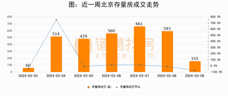 从存量房来看,2024年03月09日北京存量房单日成交155套,比昨日减少438套,环比下降73.9%。从近一周存量房成交来看,北京存量房日均成交套数为431套,03月09日单日成交155套,低于近一周平均水平64%。