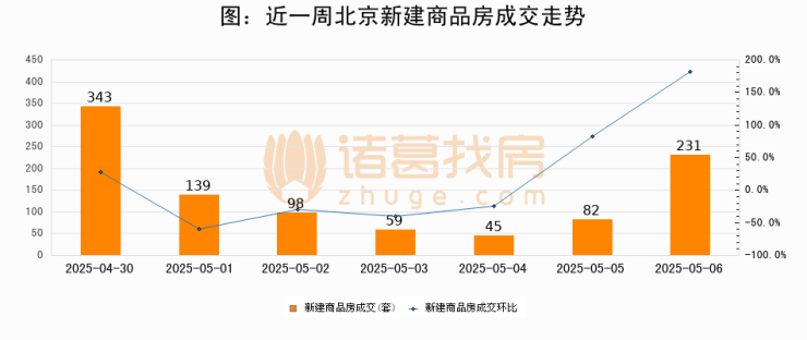 根据北京市住房和城乡建设委员会数据显示,2025年05月06日北京新建商品房成交231套,较昨日增加149套,环比上涨181.7%。近一周北京新建商品房日均成交143套。05月06日单日成交231套,高于近一周平均水平61.5%。