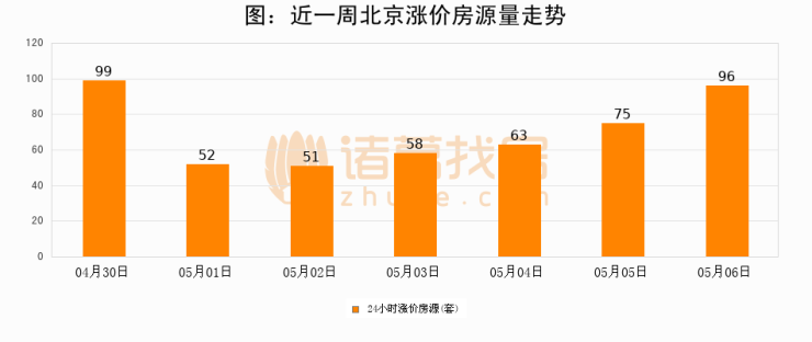 根据诸葛找房数据显示,北京24小时涨价房源量为96套,较05月05日增加21套,环比上涨28%。与此同时,涨价房源占比小幅扩大,业主信心有所提升。