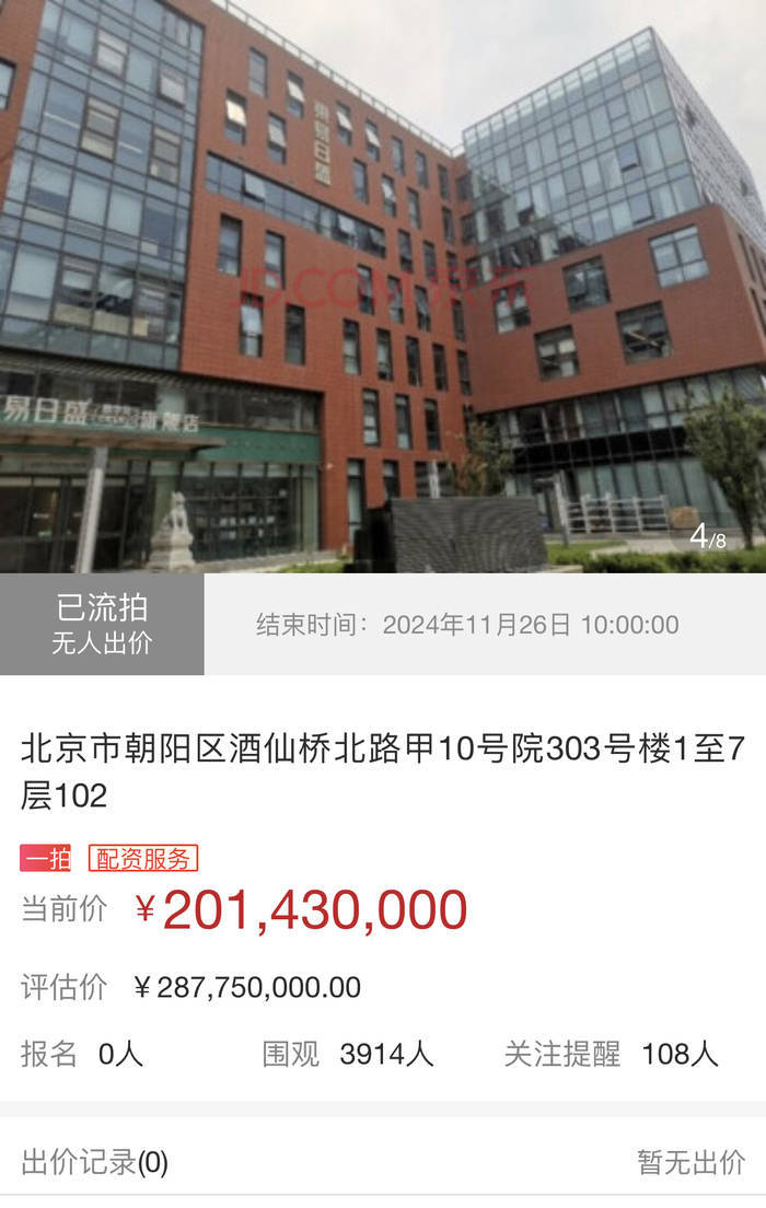 根据拍卖信息,该房产的评估价格为2.8775亿元,起拍价为2.0143亿元。但截至11月26日上午10点,该标的因为无人报价而流拍。