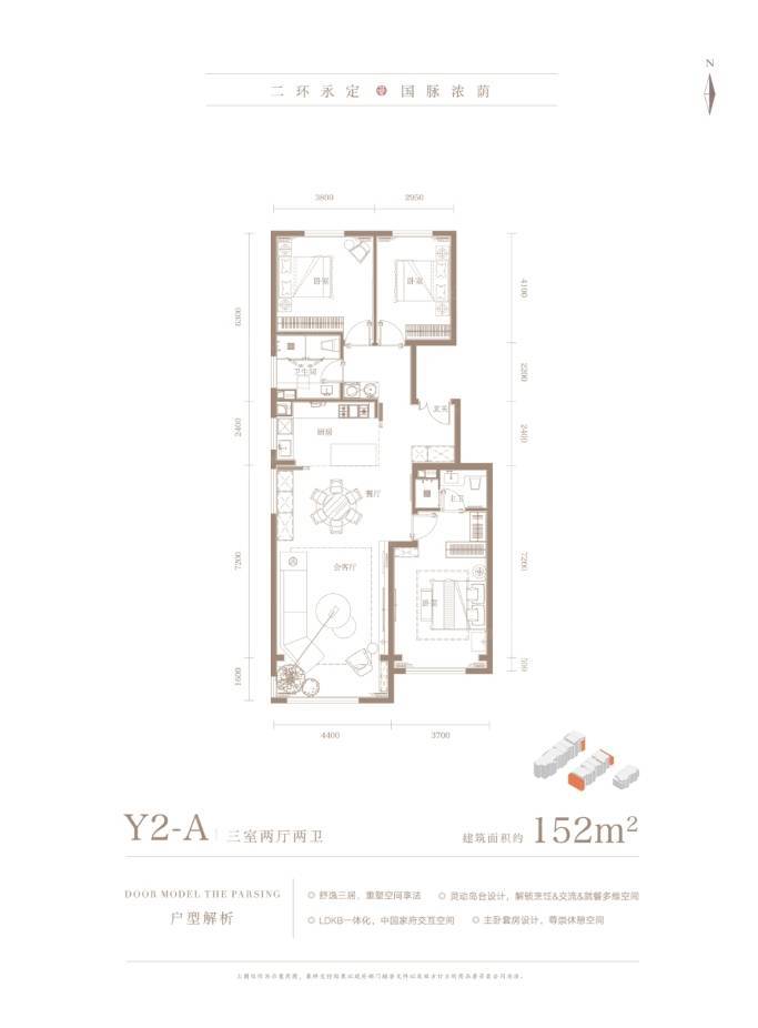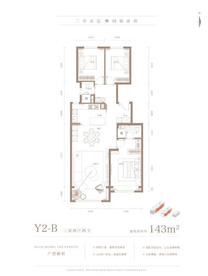 2号楼一共三个单元,中间户标准层143的三居,边户是152的三居,顶层是132的三居。