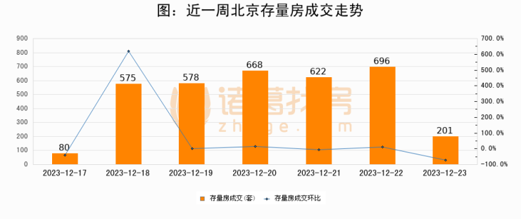 从存量房来看,2023年12月23日北京存量房单日成交201套,比昨日减少495套,环比下降71.1%。从近一周存量房成交来看,北京存量房日均成交套数为488套,12月23日单日成交201套,低于近一周平均水平58.8%。