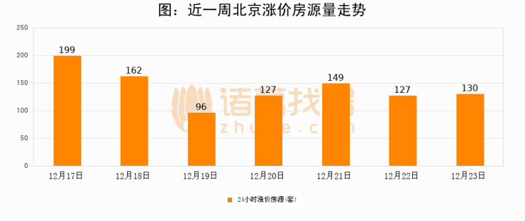 根据诸葛找房数据显示,北京24小时涨价房源量为130套,较12月22日增加3套,环比上涨2.4%。与此同时,涨价房源占比小幅扩大,业主信心有所提升。