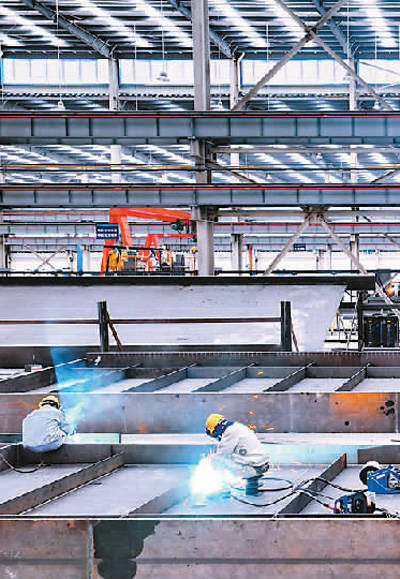 今年以来,江西省赣州市重点打造绿色装配式建筑产业,节能、节水、节地、节材的钢结构绿色建筑助力经济社会发展。图为赣州市于都县的一家钢结构企业生产车间内,工人在焊接订单产品。