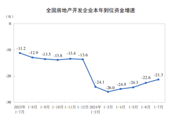 从房企资金来源来看,1—7月份,房地产开发企业到位资金同比下降21.3%,降幅较上月收窄1.3个百分点,房地产行业到位资金降幅连续4个月小幅收窄。