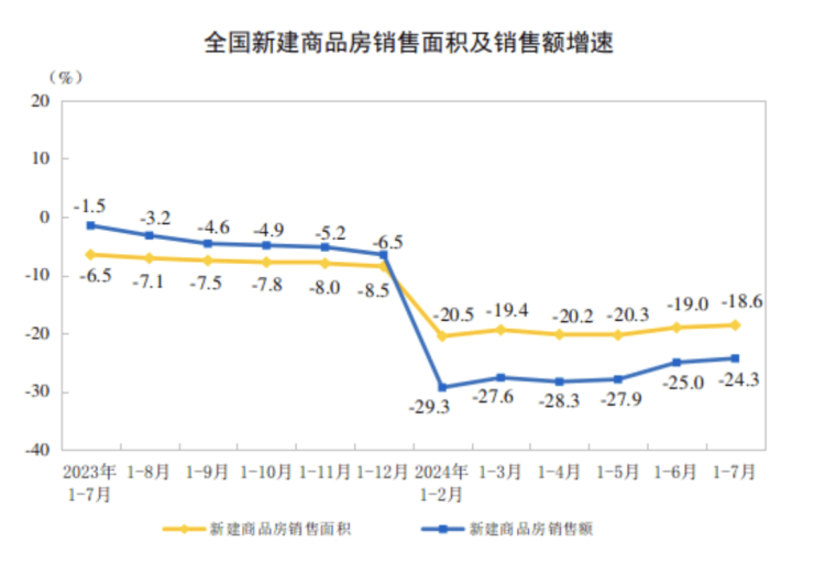 国家统计局数据显示,1—7月份,新建商品房销售面积54149万平方米,同比下降18.6%,其中住宅销售面积下降21.1%。新建商品房销售额53330亿元,下降24.3%,其中住宅销售额下降25.9%。