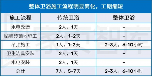 当前整体卫浴施工较快仅需2人4小时即可完成,而传统卫浴所需十余个工种,装修工期至少十六天,时间成本优势明显。
