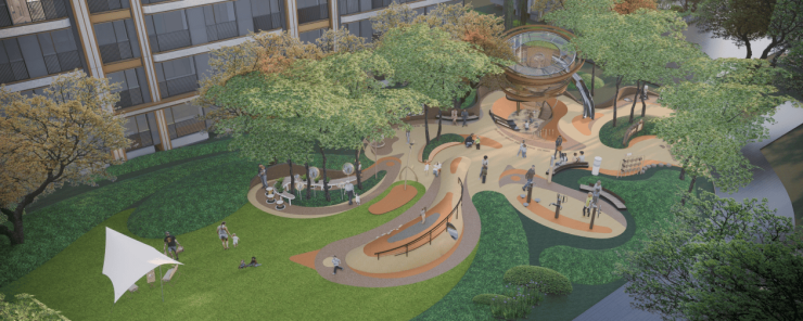 蜿蜒的风雨连廊,以流畅的线条串联起社区下沉庭院和架空层,无论是盛夏的骄阳,还是春秋冷雨,都能让归家之路舒适惬意。
