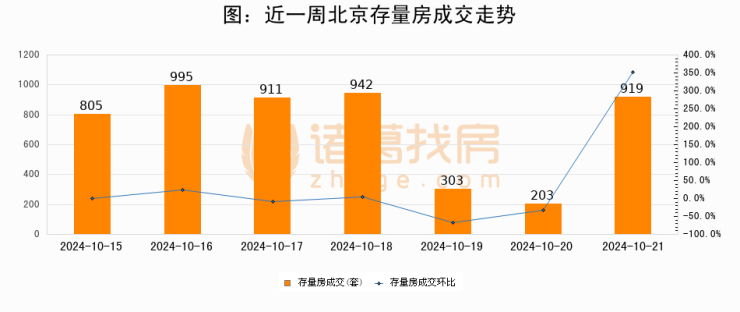 从存量房来看,2024年10月21日北京存量房单日成交919套,比昨日增加716套,环比上涨352.7%。从近一周存量房成交来看,北京存量房日均成交套数为725套,10月21日单日成交919套,高于近一周平均水平26.8%。